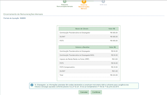 Aparecerá nesta tela um resumo dos dados que constarão na guia do Simples Doméstico. Após confirmar se está tudo correto o empregador deverá clicar em “confirmar” e em seguida clicar em “emitir guia”.