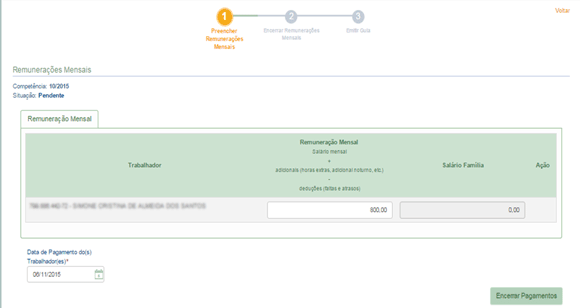 O empregador deverá preencher o valor da remuneração mensal do empregado, já considerando os adicionais de horas extras, adicional noturno, se for o caso, bem como descontos por faltas e atrasos, caso existam. Além da data de pagamento e informar se existe salário família, após preencher os campos deverá clicar em encerrar pagamentos.